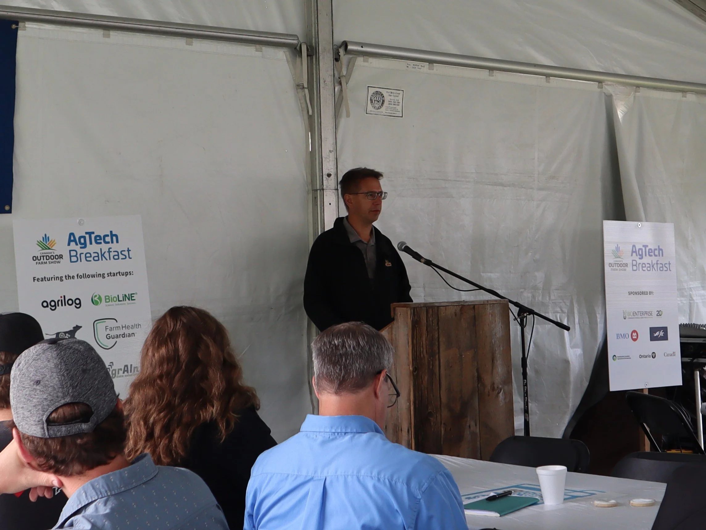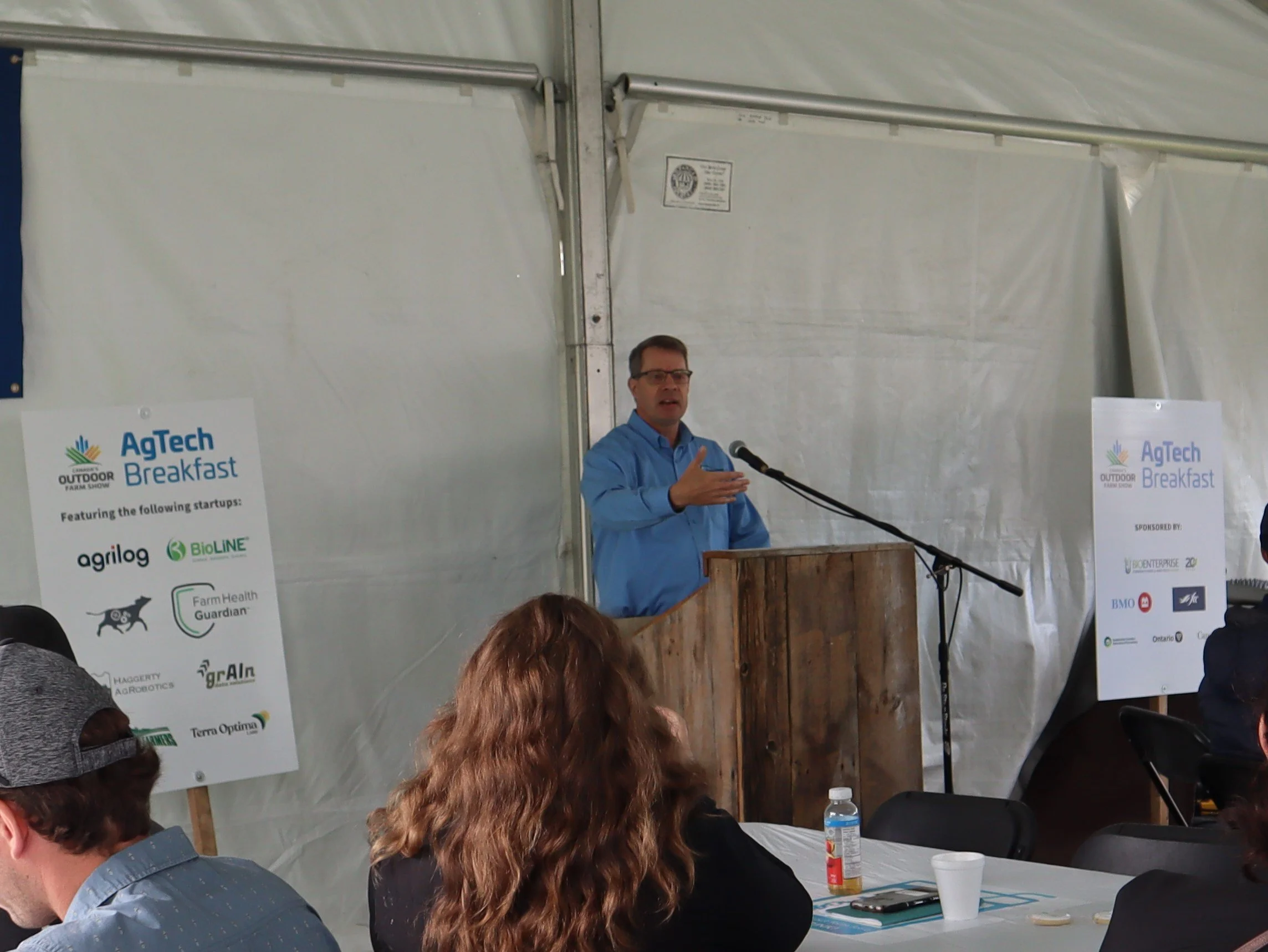 Rob Hannam of Farm Health Guardian and Chuck Baresich of Haggerty AgRobotics spoke at the Agri-Tech Breakfast at Canada's Outdoor Farm Show. Rob and Chuck shared what they are working on and provided great advice for startup companies.